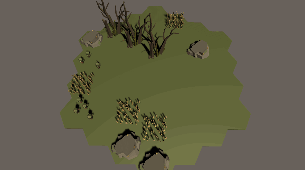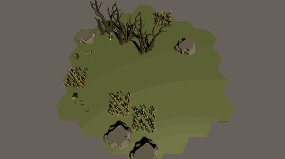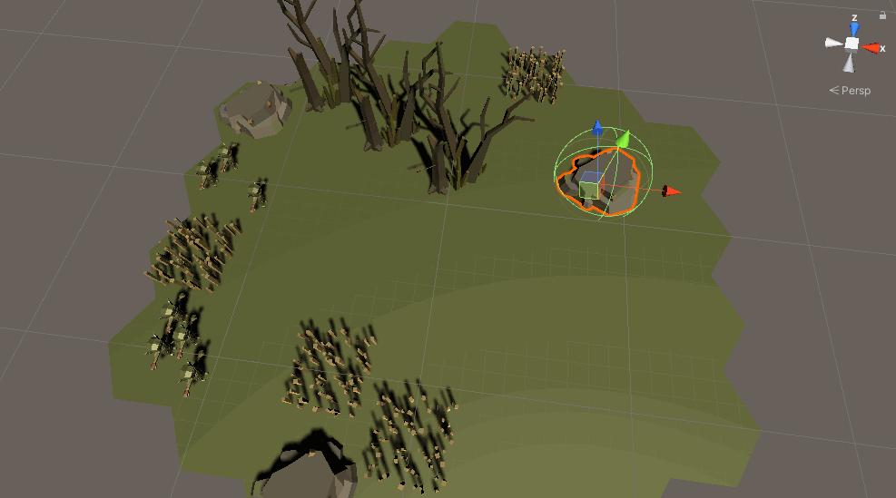 Next, I needed them to avoid obstacles. It’s a work in progress. I’m using a sphere collider on the rock and simply applying a pseudo-force in the opposite direction of the collision. I’m qualifying the force because it’s not really a force. In its current iteration, the units move a little bit every tick. They don’t have a real, physics-based velocity with acceleration tied to it.