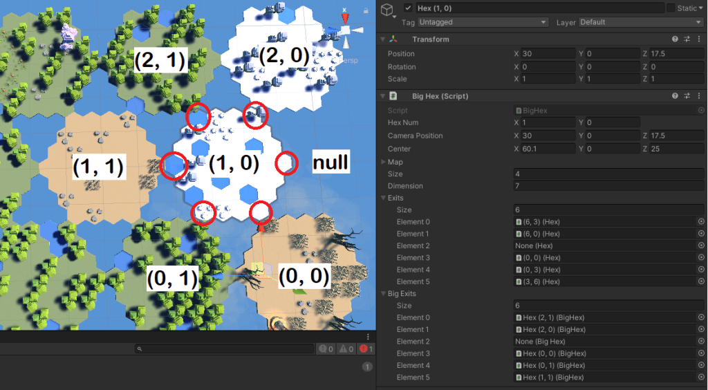 Clearly that idea wasn’t going to fly. An alternative I spent a good chunk of time trying to design was a little more based on pathfinding. Each Big Hex (the big platforms) has a list of Big Exits (Big hexes adjacent to it) and Exits (small hexes that serve as the connection from one Big Hex to another). On creating the map, I saved each of these values, so the Flock Master can theoretically move to the correct big hex before trying to move in a straight line.